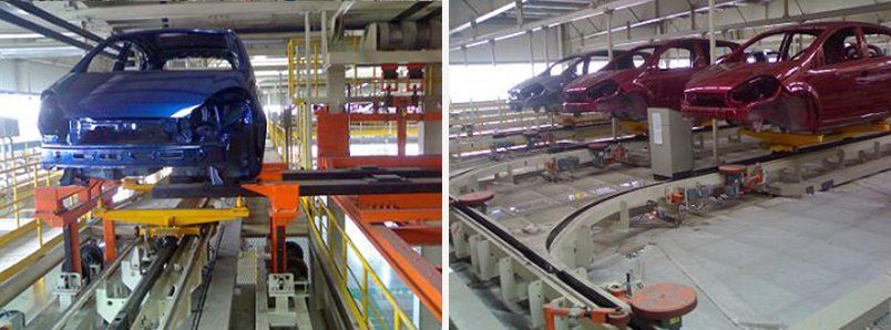 該系統采用空中、地面摩擦線,主要用于:P11/P12、B13的白車身骨架輸送,簡稱為轉運線,P11/P12/B13/H13/S22/A18白車身整車焊裝到涂裝下件點的輸送和存儲,簡稱存儲線。該摩擦線能滿足前六種車型的同時共線生產輸送用。