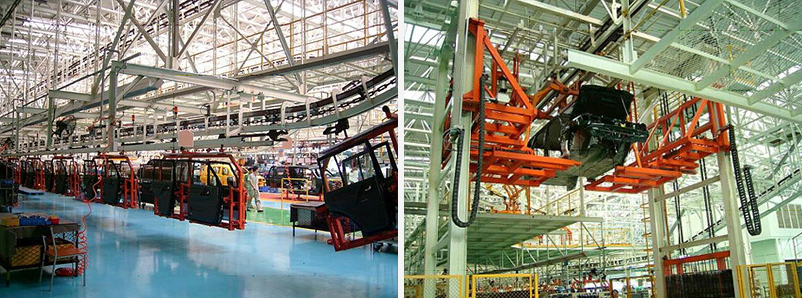 長豐汽車公司永州基地新總裝車間輸送系統是為了適應不斷擴大的產量而新建的,批量年產5萬輛,分底盤線、內飾線、車門線以及上下轉掛用的升降機及隨動裝置,車身底盤裝配輸送機系統是YTJ6型號的輸送機組成,共由一條快鏈和一條慢鏈組成,工藝速度1-2.5m/min,鏈條長度約780米,小車積放長度5300mm,工位間距6128mm,小車組采用6車組型式,小車數27套。內飾線采用YTJ6型號的輸送機,共由一條快鏈和一條慢鏈組成,工藝速度1-2.5m/min,鏈條長度約500米,小車積放長度5300mm,工位間距6128mm,小車組采用6車組型式,小車數24套。車門線采用YTJ4型號的輸送機,共由兩條快鏈和一條慢鏈組成,工藝速度1-2.5m/min,鏈條長度約1200米,小車積放長度3500mm,工位間距4300mm,小車組采用3車組型式,小車數85套。