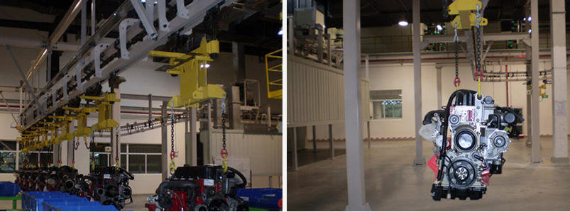 該項目是北汽福田康明斯投資的一個發動機廠,主要生產柴油發動機。積放式懸掛輸送系統用于工件的連續輸送和儲存。該系統分為兩個部分,NO1負責把兩種柴油機總成輸送到熱試線,系統采用兩臺變頻電機減速機驅動,實現兩種發動機混流上下線,空中可實現積放20分鐘。在總裝線下料處有兩臺帶式升降機,一臺用于2.8L發動機上料,另一臺用于3.8L發動機上料。熱試線下料處有兩臺帶式升降機,兩種發動機可通用。NO2將兩種柴油機總成從熱試線經涂裝線輸送到附件裝配。系統共有六條輸送鏈,采用地面立柱和空中吊掛形式。分別完成輸送、工位操作、存儲、工位操作、烘干后冷卻和輸送等功能。系統設四臺帶式升降機,用于發動機的上線和下線。積放式懸掛輸送機控制系統通過工業以太網形式接受工藝信息,并將系統運行狀態和故障信息通過以太網發送的上位機系統,系統自動讀取兩種發動機的區分信息和標志,實現自動區分工件的功能。系統預留RIFD的PROFIBBUS接口,方便以后RIFD系統的擴展。