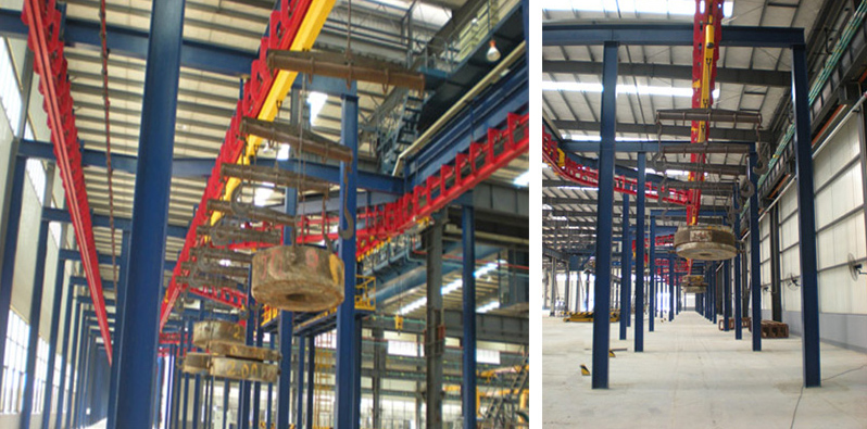 該輸送系統用于塔機結構件的涂裝生產線,承擔涂裝工件的輸送,是全天候作業的工作場所。輸送的主要構件有:塔身、塔頂、標準節、平衡臂、起重臂。工件外形尺寸:結構件12000×2800×2800mm;重量:單掛6000kg、雙掛12000kg;生產綱領:兩班制,年產3000臺套。系統采用公司新開發的重型積放式懸掛輸送機,該機具有載重量大,工作效率高等特點。