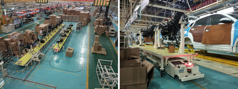 安徽獵豹汽車有限公司屬于長豐集團,主要生產SUV與皮卡類車型,該AGV項目用于總裝車間儀表線物流配送,AGV通過牽引臺車,將裝配好的儀表盤運送至內飾線安裝,AGV帶著空臺車返回儀表盤線,循環(huán)運行,滿足生產線40JPH節(jié)拍。AGV采用磁道航導引系統(tǒng),并通過控制系統(tǒng)與其他管理系統(tǒng)即時通訊,可實現(xiàn)無人自動化運輸,是汽車行業(yè)等提升行業(yè)競爭力、減少人工成本、提高倉配效率的選擇。
